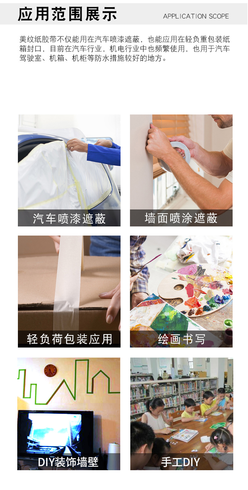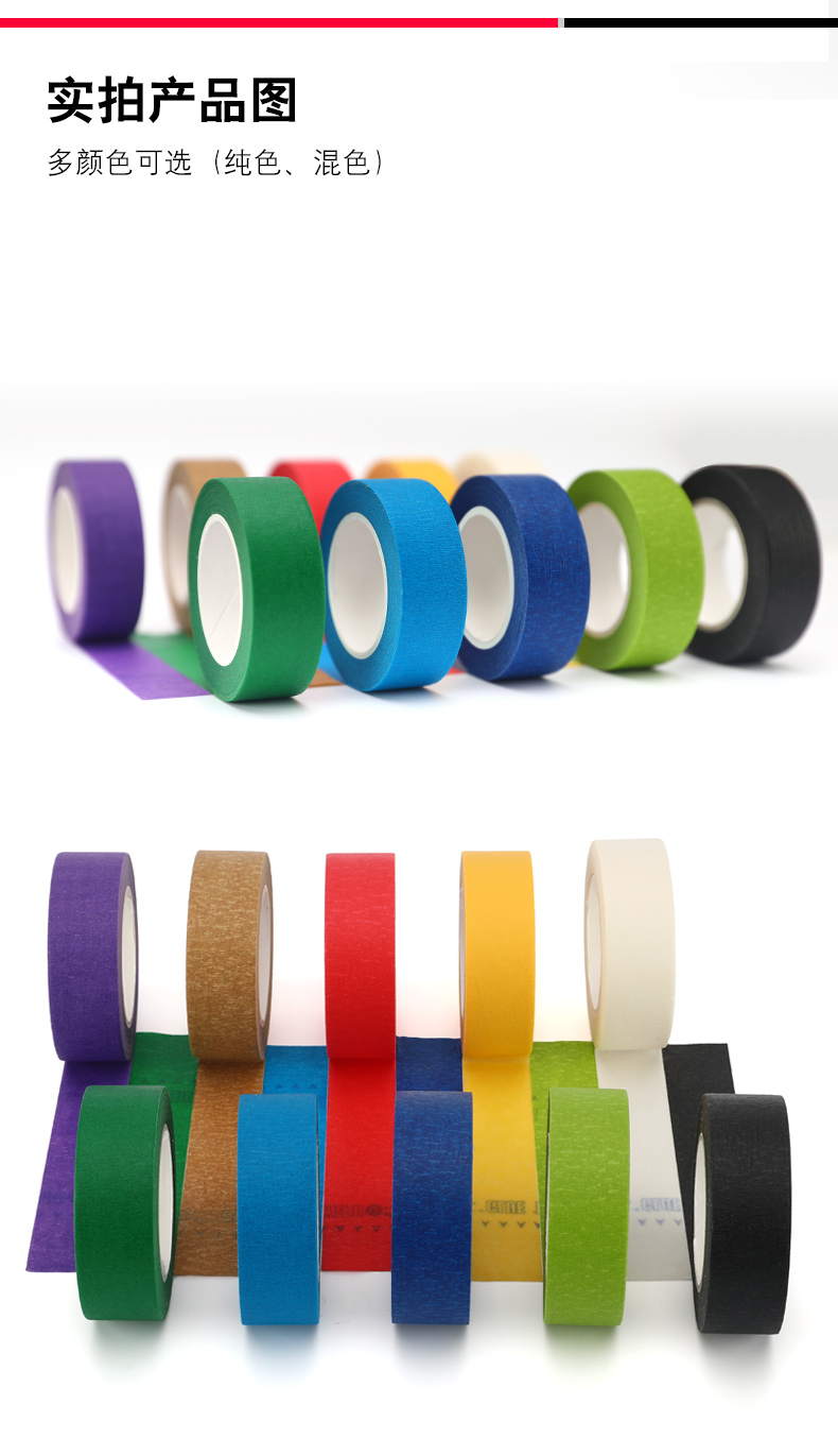 - 美紋紙膠帶 黃色美紋紙,紅色美紋紙,黑色美紋紙 藍(lán)色美紋紙,綠色美紋紙 ,白色美紋紙,桔紅色美紋紙 咖啡色 紫色 淺紅色美紋紙 是采用皺紋紙的基材的橡膠型的膠型所制 單面涂覆壓敏膠。
