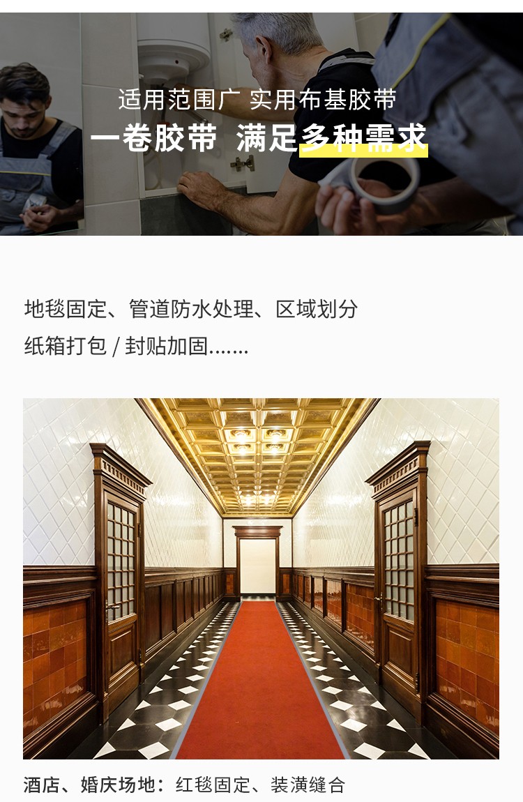 - 布基膠帶以聚乙烯與紗布纖維的熱復(fù)合為基材。涂高粘度合成膠水,有較強(qiáng)的剝離力、抗拉力、耐油脂、耐老化、耐溫、防水、防腐蝕,是一種粘合力比較大的高粘膠帶。