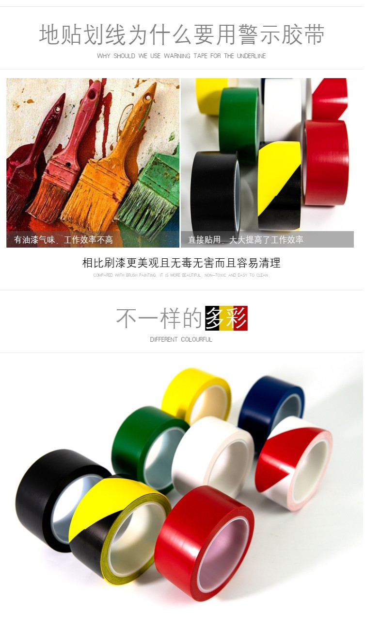 - 警示膠帶又叫標(biāo)識(shí)膠帶、貼地膠帶、地板膠帶、地標(biāo)膠帶等。是以PVC薄膜為基材的膠帶,涂上橡膠型壓敏膠制造而成。