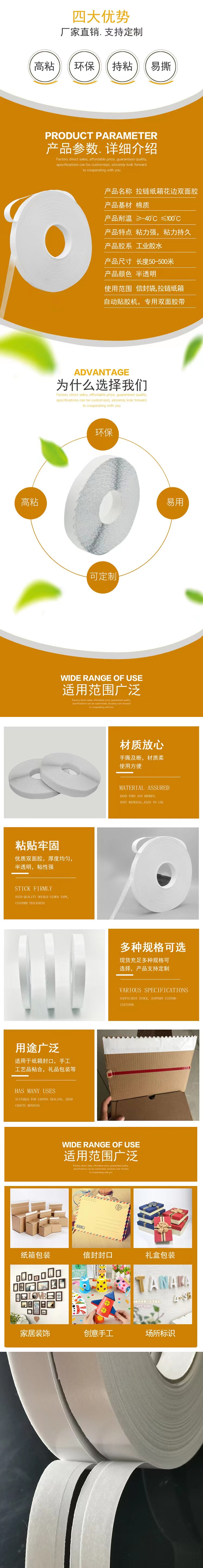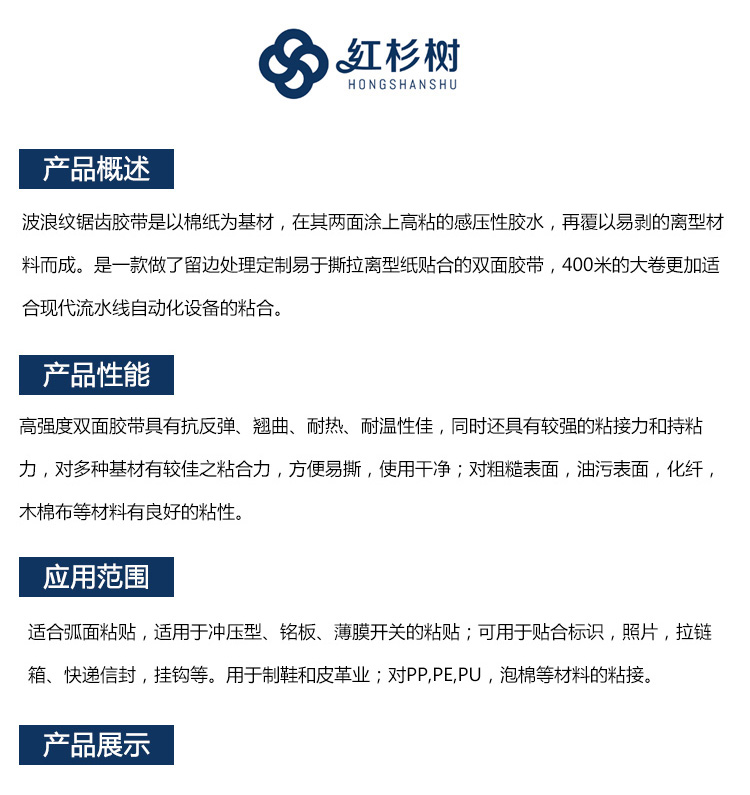- 波浪紋鋸齒膠帶是以棉紙為基材,在其兩面涂上高粘的感壓性膠水,再覆以易剝的離型材料而成。是一款做了留邊處理定制易于撕拉離型紙貼合的雙面膠帶,400米的大卷更加適合現(xiàn)代流水線自動(dòng)化設(shè)備的粘合。